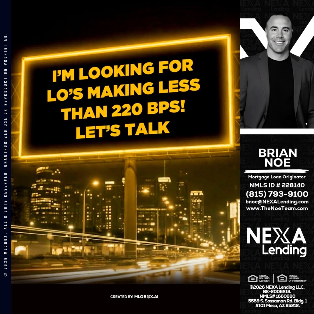 Looking for MLOs - Brian Noe -Mortgage Loan OriginatorHi, my name is Brian Noe. I’m a Loan Officer with NEXA Lending LLC., offering personalized mortgage solutions, fast customized quotes, great rates and service with integrity.